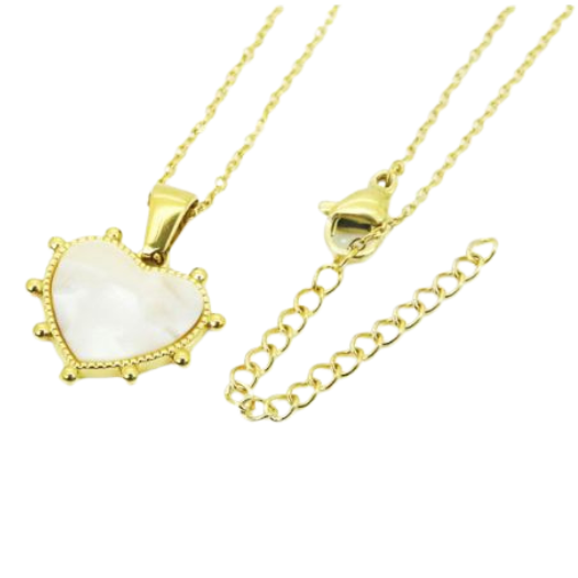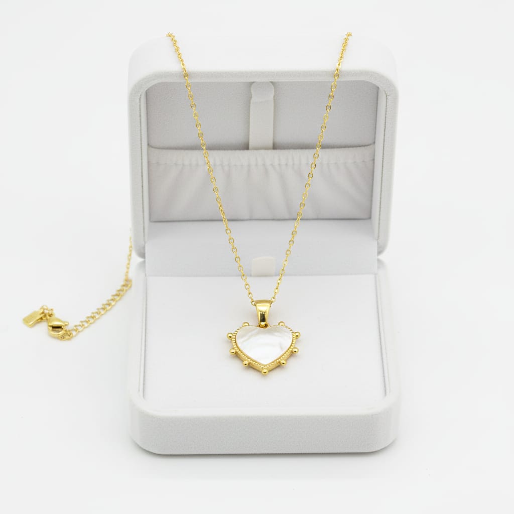 Sally es una cadena sencilla y bonita, con un pendant de corazón en madre perla que le da un toque femenino y delicado. El corazón mide alrededor de 1/2 pulgada, y la cadena tiene un largo de casi 20 pulgadas + 2 pulgadas de extensor, perfecto para lucirlo sin que quede muy ajustado.