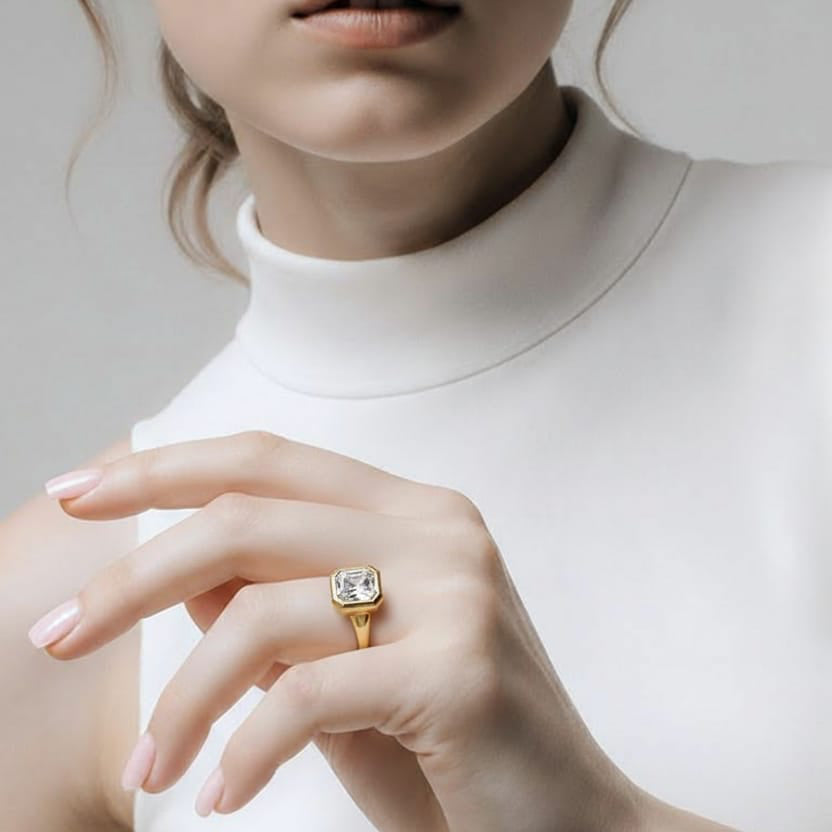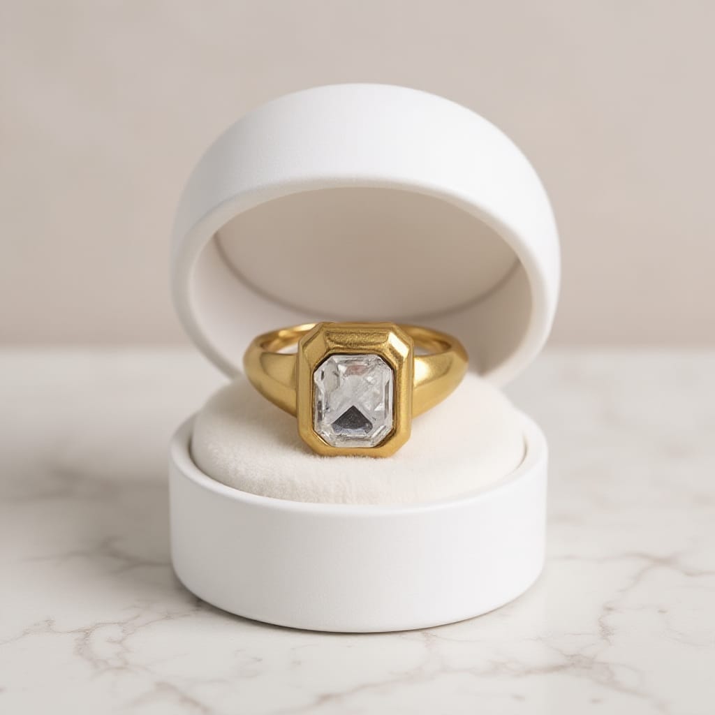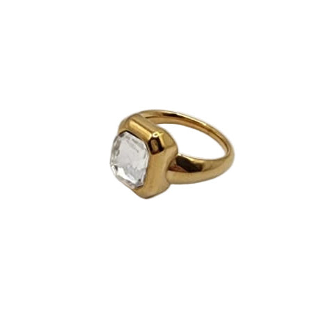 Lady es una sortija que queda bonita sin ser exagerada. Tiene una piedra rectangular de tamaño mediano que se ve moderna y elegante, pero sigue siendo liviana y cómoda para usar todo el día. Está hecha en stainless steel, así que mantiene su brillo y color sin problema.
