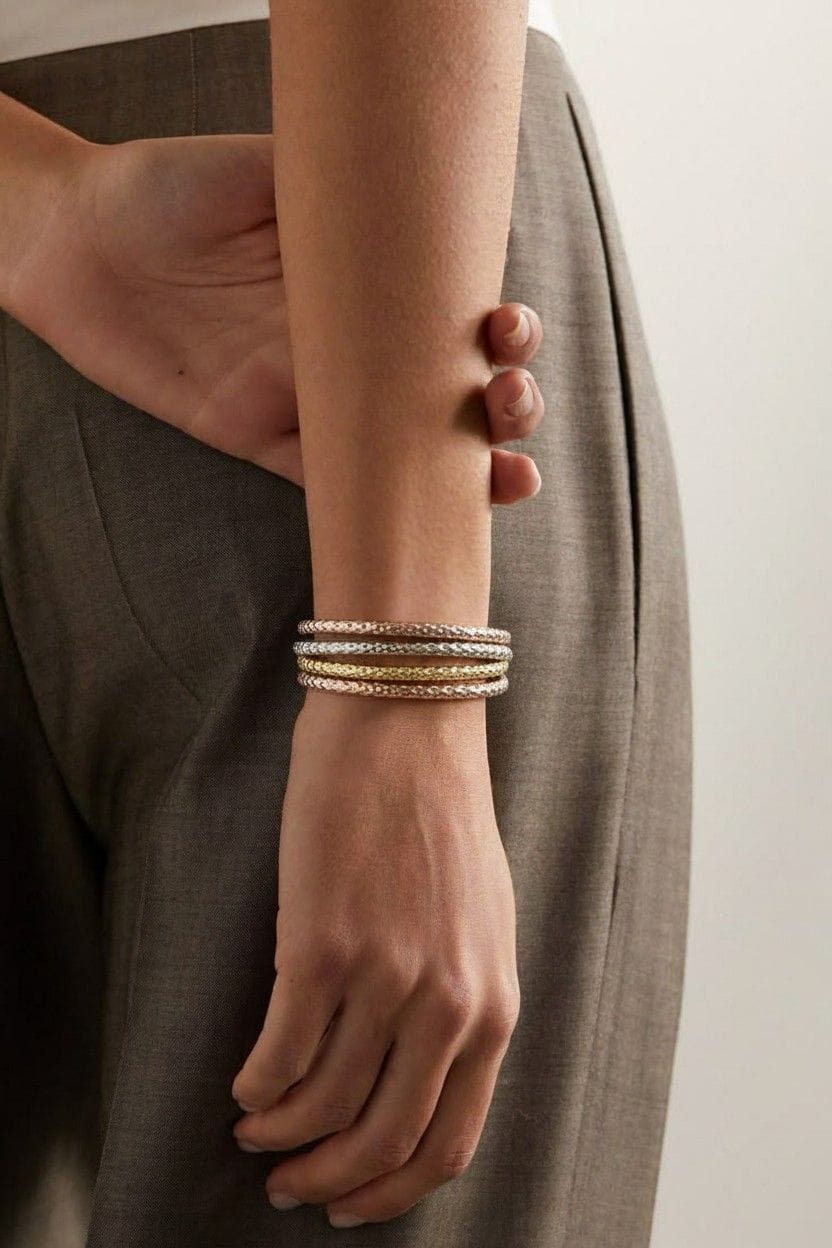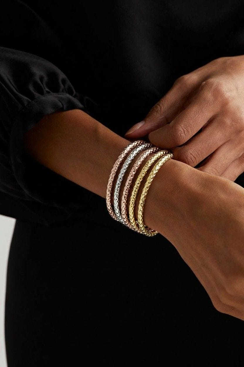 Cada una mide aproximadamente 5 mm de ancho y tiene una textura labrada estilo martillado que les da un brillo único y súper moderno. Puedes usarlas individuales o jugar con dos o tres tonos para un estilo más llamativo y chic.