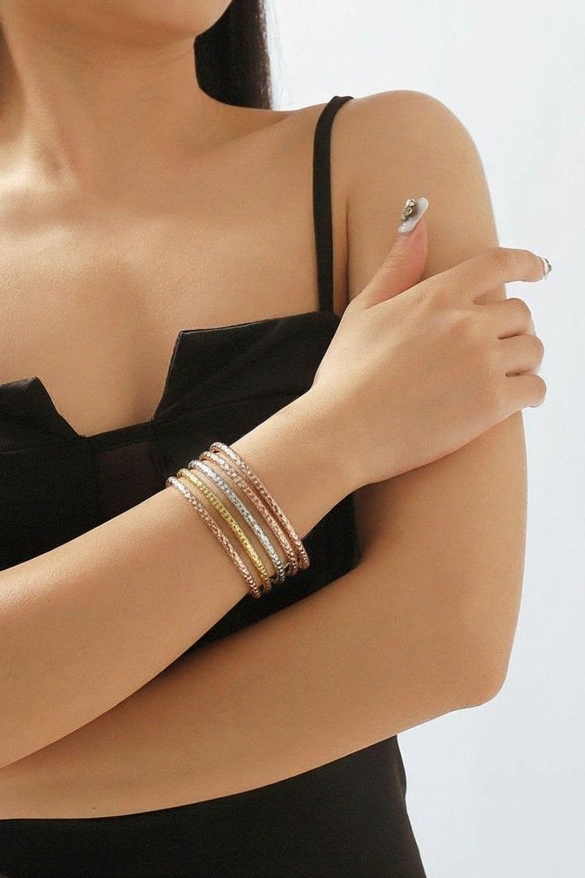 Este set de bangles es ese accesorio que nunca falla. Son tres piezas en stainless steel —una en oro rosado, otra en oro dorado y otra en color plata— perfectas para combinar con cualquier outfit, desde lo más casual hasta algo más elegante.