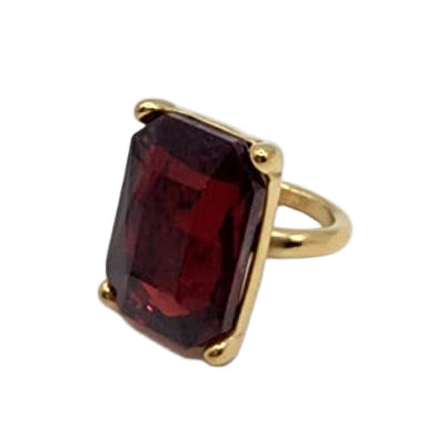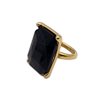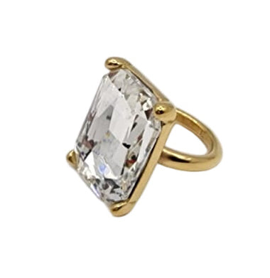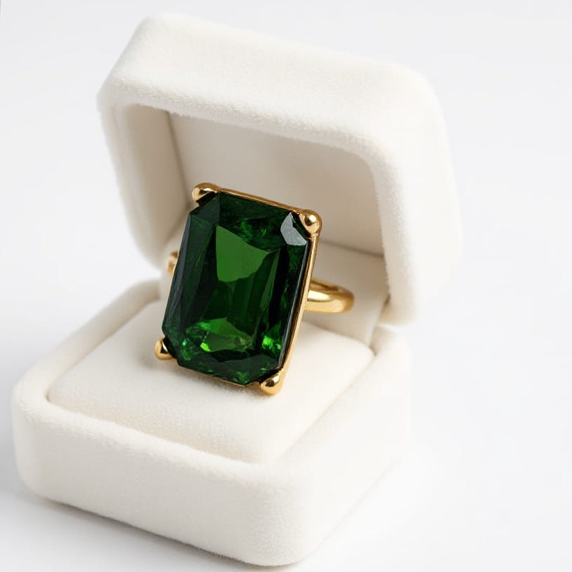 Esta sortija es un detalle que deslumbra con delicadeza. Su cristal afacetado de corte rectangular —de casi tres pulgadas de largo— captura la luz de una manera preciosa, creando un brillo suave pero imposible de ignorar. Fabricada en stainless steel, mantiene su elegancia y color sin esfuerzo.