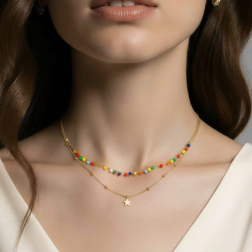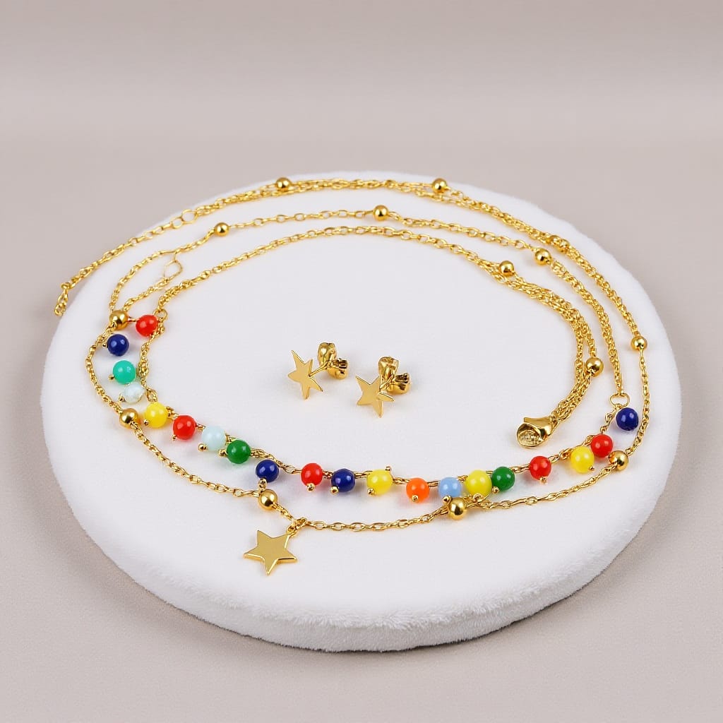 Stella es un set tipo layers que trae dos cadenas y unas pantallas studs en forma de luna. Una de las cadenas tiene un pendant de luna y la otra viene con beads de colores que le dan un toque divertido y diferente. Todo el set está hecho en stainless steel, así que es resistente, liviano y fácil de combinar.
