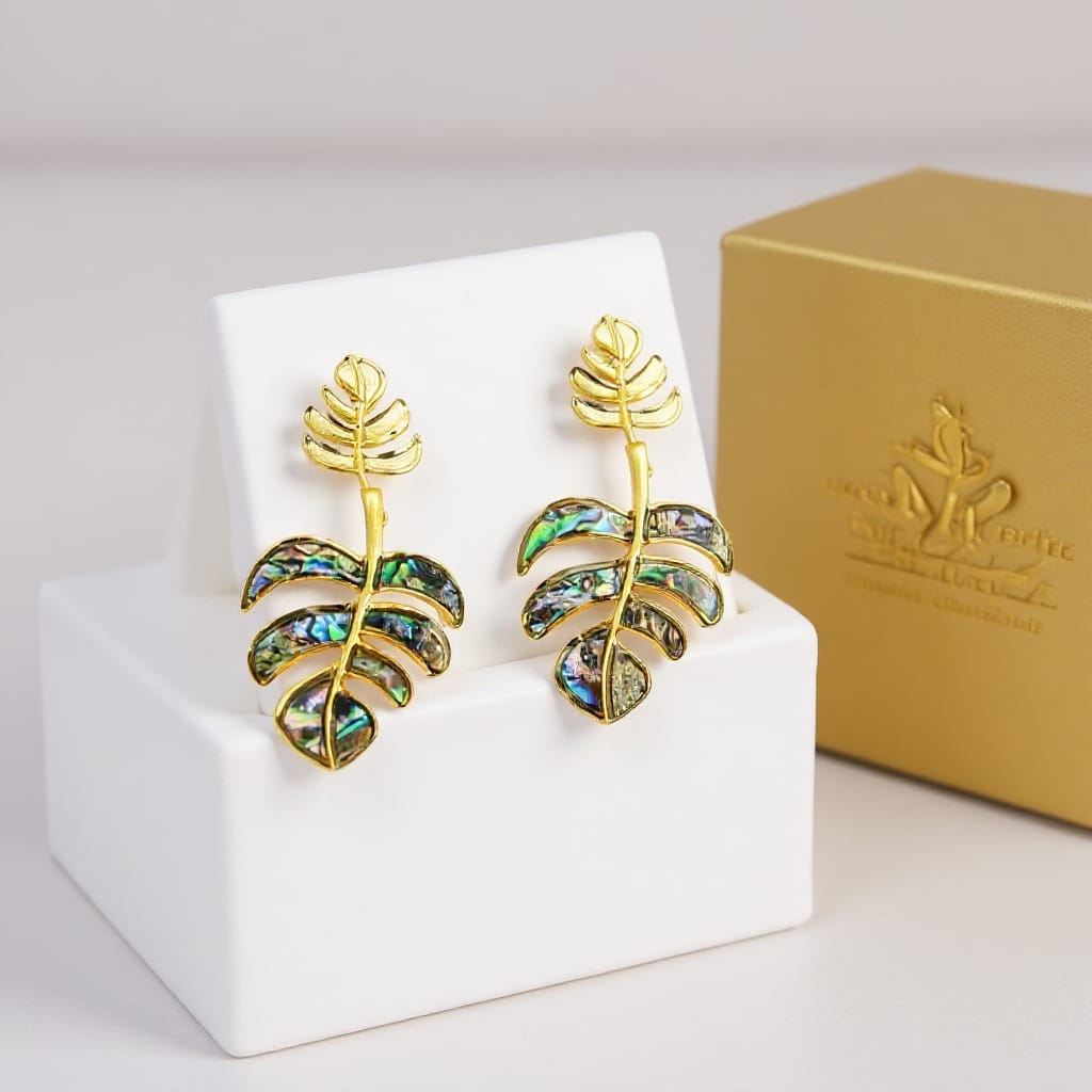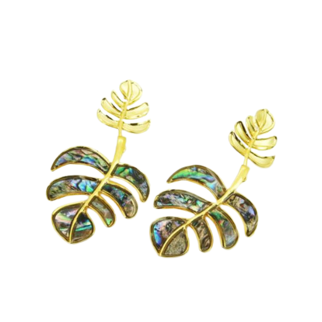 Estas pantallas son una pieza que lo dice todo sin tener que decir nada. Grandes, vistosas y llenas de encanto, combinan stainless steel con madre perla que refleja destellos preciosos en forma de hoja. A pesar de su tamaño —aproximadamente 2.5 pulgadas de largo— son sorprendentemente livianas, así que puedes usarlas con total comodidad.